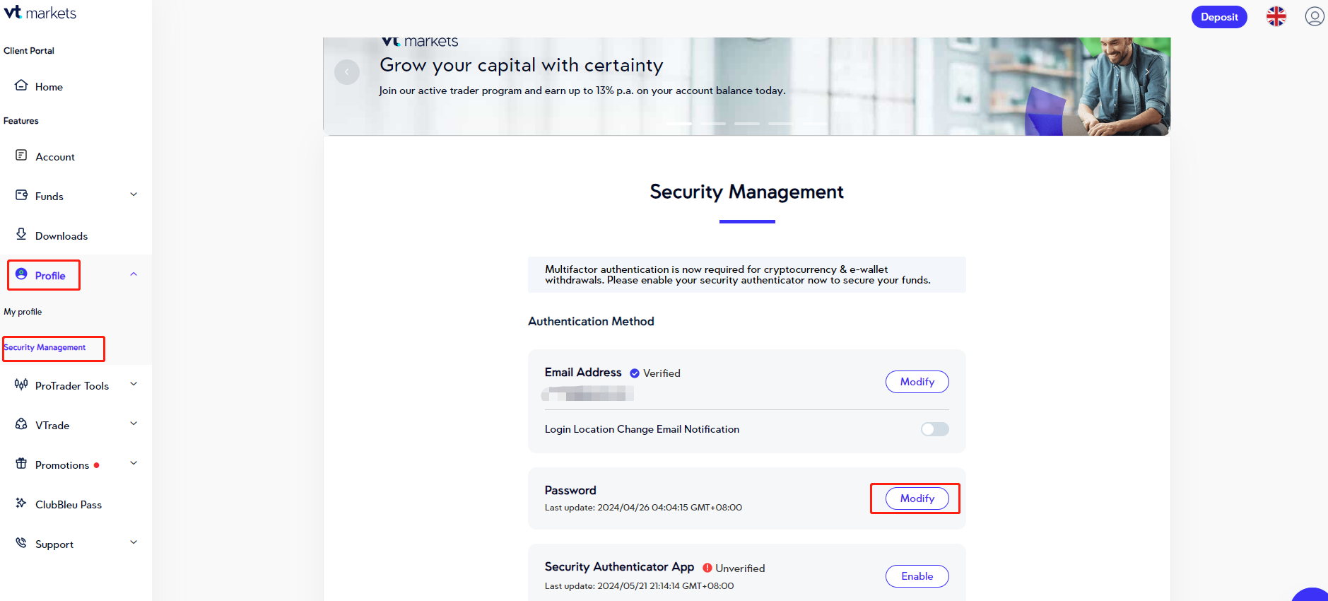 Comme mesure de sécurité renforcée pour protéger vos fonds, la fonction de retrait ne sera accessible qu'après 24 heures suivant la modification réussie du mot de passe du Portail Client. Pour des informations plus détaillées, veuillez vous référer au message contextuel sur la page de retrait de votre Portail Client.